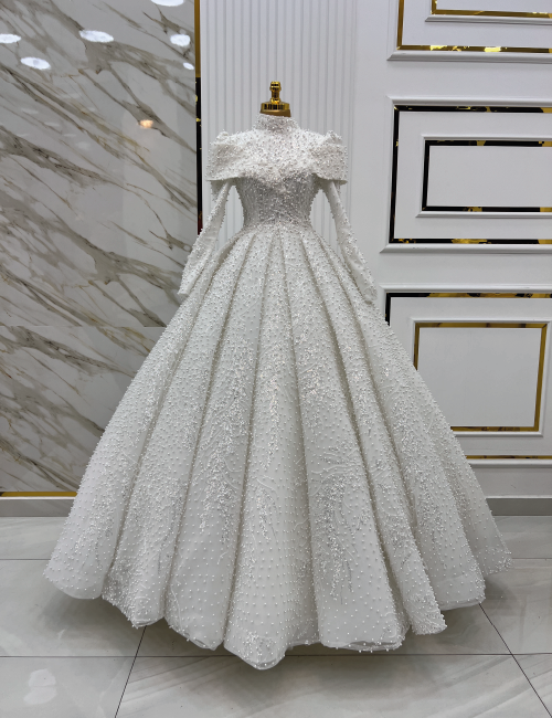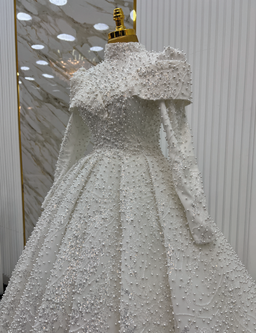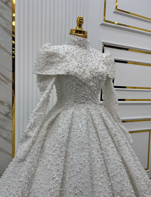 Efsanevi Aşk gelinliği, beyaz dantel ve tül kumaşların mükemmel birleşimini yansıtır. Gövdesindeki zarif dantel işlemeler, gelinliğe sofistike ve romantik bir hava katar. Omuzlardan akarak dökülen tül, gelinliğe hafif ve eterik bir görünüm sağlar. İnci ve kristal detaylar, gelinliğin parıltısını artırırken, bel kısmındaki ince kuşak zarif hatları vurgular. Geniş etek kesimi, gelinliğe peri masallarını andıran bir zarafet kazandırır. Bu gelinlik, düğün gününde her gelinin kendini büyülü ve özel hissetmesini sağlayacak şekilde tasarlanmıştır.