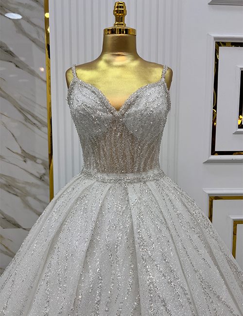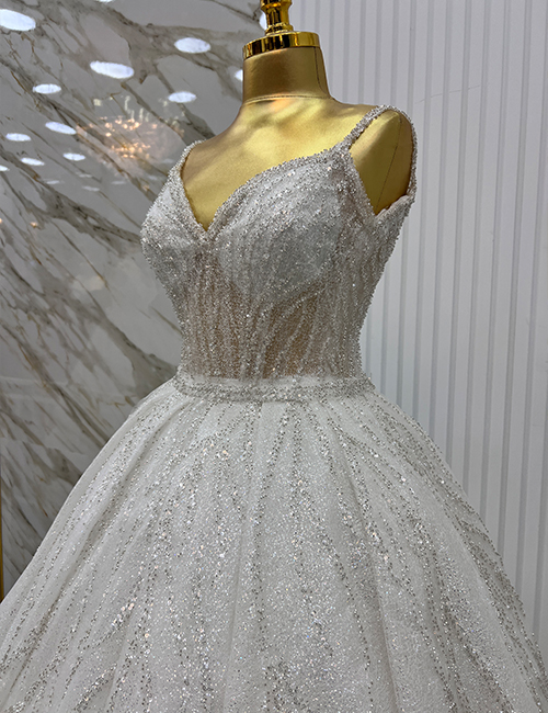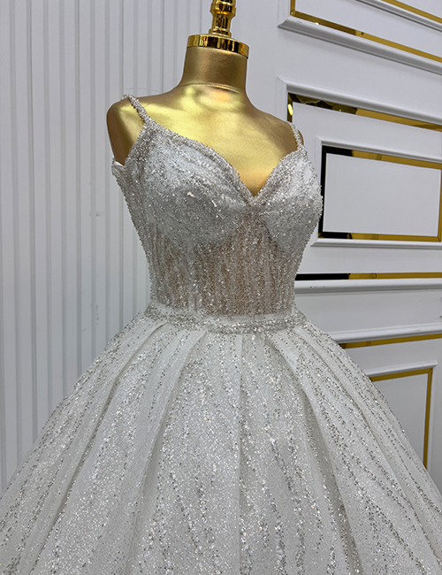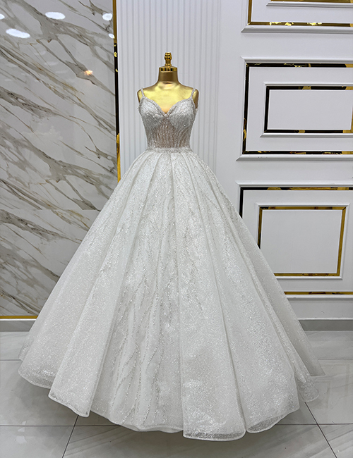 Bu büyüleyici gelinlik, minimal tasarımı ve ışıltılı detaylarıyla modern zarafeti yeniden tanımlıyor. İnce askıları ve derin V yakası, narin bir görünüm sunarken, üzerindeki parlak taş işlemeleri her adımda ışık saçmanızı sağlıyor. Prenses kesim eteği ile feminen bir siluet yaratırken, sade ve çarpıcı detaylarıyla düğün gününüzde unutulmaz bir stil vadediyor.
