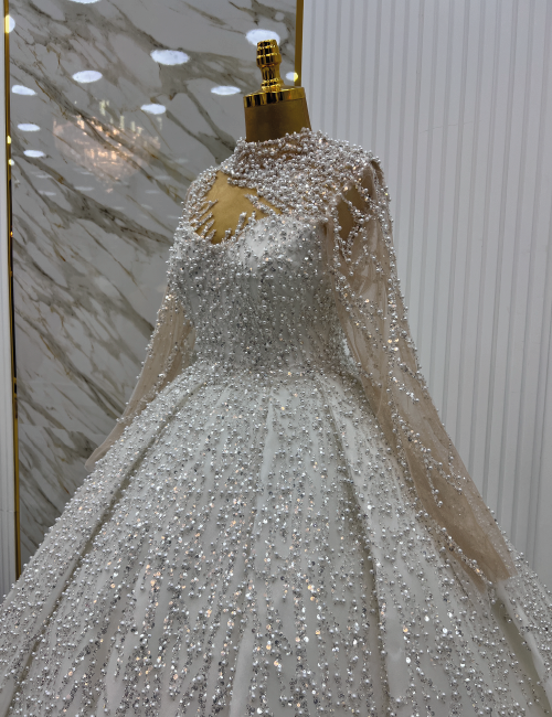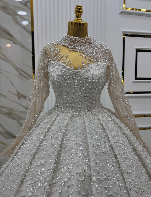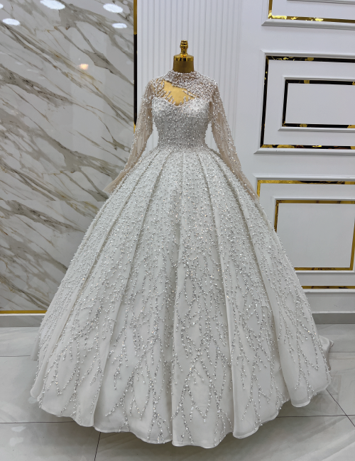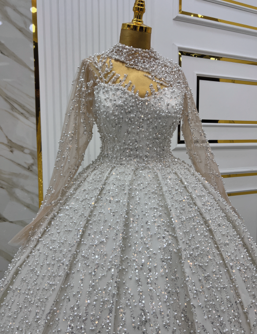 Kristal Işıltısı gelinliği, beyaz kumaş üzerine işlenmiş ince boncuk ve payet detaylarıyla zarif bir tasarım sunar. Yüksek yakası ve tamamen boncuk işlemeleriyle bezenmiş gövde kısmı, elbiseye sofistike ve zarif bir hava katar. Geniş ve akıcı etek kesimi, gelinliğe hafiflik ve hareket kazandırırken, boncuk ve payet detayları parıltılı bir görünüm sağlar. Elbisenin arka planındaki beyaz ve altın detaylı duvarlar, zarafeti ve lüksü vurgular. Bu gelinlik, düğün gününüzde kendinizi özel ve büyüleyici hissetmenizi sağlayacak şekilde tasarlanmıştır.