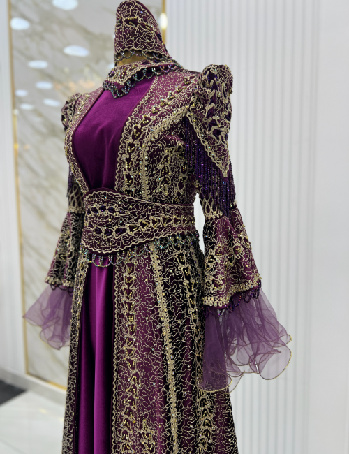 Morun İhtişamı Bindallı, büyüleyici mor tonu ile dikkat çekiyor. Geleneksel bindallı çizgilerini korurken, zarif işlemeleri ve modern dokunuşlarıyla göz kamaştırıcı bir duruş sergiliyor. İhtişamlı detaylarıyla özel günlerinize asil bir hava katacak olan bu tasarım, sofistike ve etkileyici görünmek isteyenler için mükemmel bir tercih. Kına gecesi veya nişan gibi özel anlarınızda, Morun İhtişamı ile kendinizi kraliyet zarafetinde hissedin.