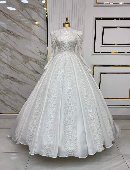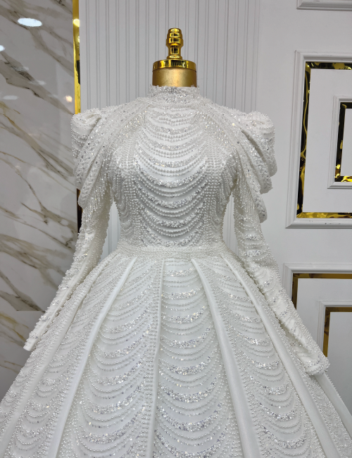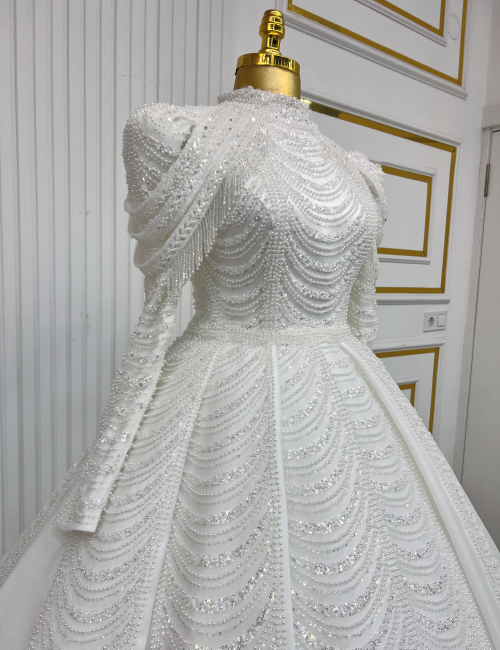Işıltılı boncuk işlemeleri ve zarif detaylarıyla dikkat çeken bu gelinlik, özel günleriniz için eşsiz bir tercih sunuyor.