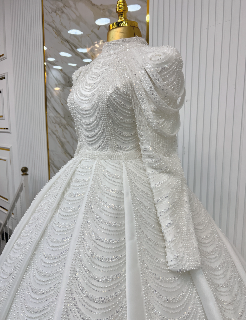 Zarafet Işıltısı Gelinlik, modern tasarım anlayışıyla klasik detayları bir araya getiriyor. Üst kısımdan eteklere kadar uzanan boncuk işlemeleri, gelinliğe göz alıcı bir ışıltı katarken, hacimli eteği ve zarif omuz detayları romantik bir silüet sunuyor. Yüksek kalite kumaşı ve ince işçiliğiyle özel günlerinizde hem rahat hem de şık hissetmeniz için tasarlanmıştır. Baştan sona özenle hazırlanmış bu gelinlik, unutulmaz bir görünüm için ideal bir seçimdir.