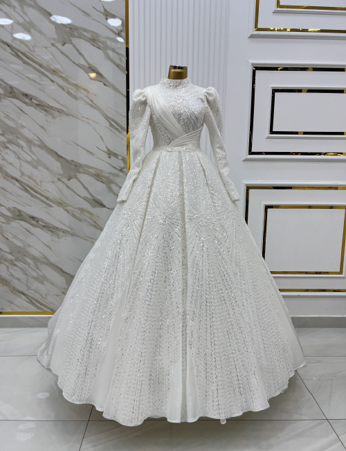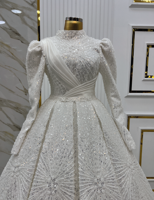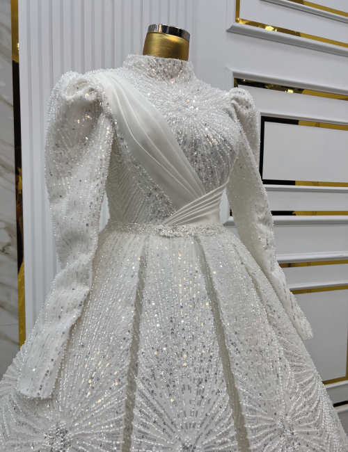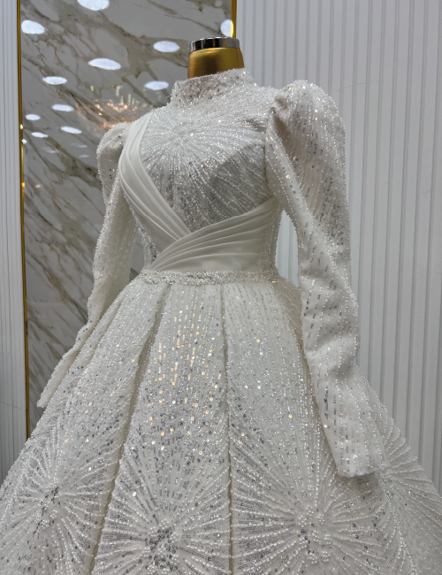 Zümrüt Işıltısı gelinliği, beyaz kumaş üzerine işlenmiş zarif boncuk ve payet detaylarıyla dikkat çekici bir tasarıma sahiptir. Yüksek yakası ve ince işlenmiş boncuklarla süslenmiş uzun kollu gövde kısmı, elbiseye sofistike ve zarif bir hava katar. Boncuk ve payet detayları, etek kısmında ışıltılı ve akıcı bir görünüm sağlar. Geniş ve akıcı kesimi sayesinde gelinliğin hem rahat hem de şık bir duruşu vardır. Bu gelinlik, düğün gününüzde kendinizi büyüleyici ve özel hissetmenizi sağlayacak şekilde tasarlanmıştır.