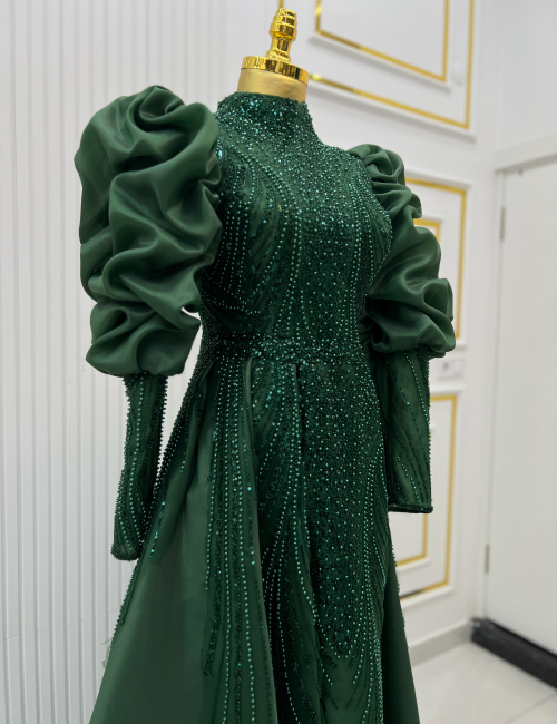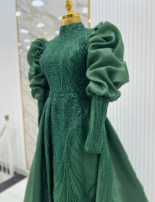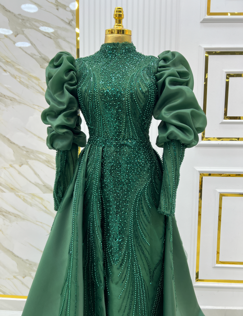 Zümrüt Işıltısı Bindallı, zarif zümrüt yeşili rengi ve göz alıcı işlemeleriyle fark yaratan bir tasarıma sahiptir. Kol detaylarındaki kabarık dokunuşlar ve ışığı yansıtan işlemeleriyle, hem klasik hem de modern bir şıklık sunar. İhtişamlı ve asil bir görünüm için tasarlanan bu bindallı, kına gecenizde sizi gecenin yıldızı yapacak. Geleneksel zarafeti modern çizgilerle buluşturan Zümrüt Işıltısı Bindallı, özel gününüzde kendinizi özel hissetmeniz için mükemmel bir tercih.